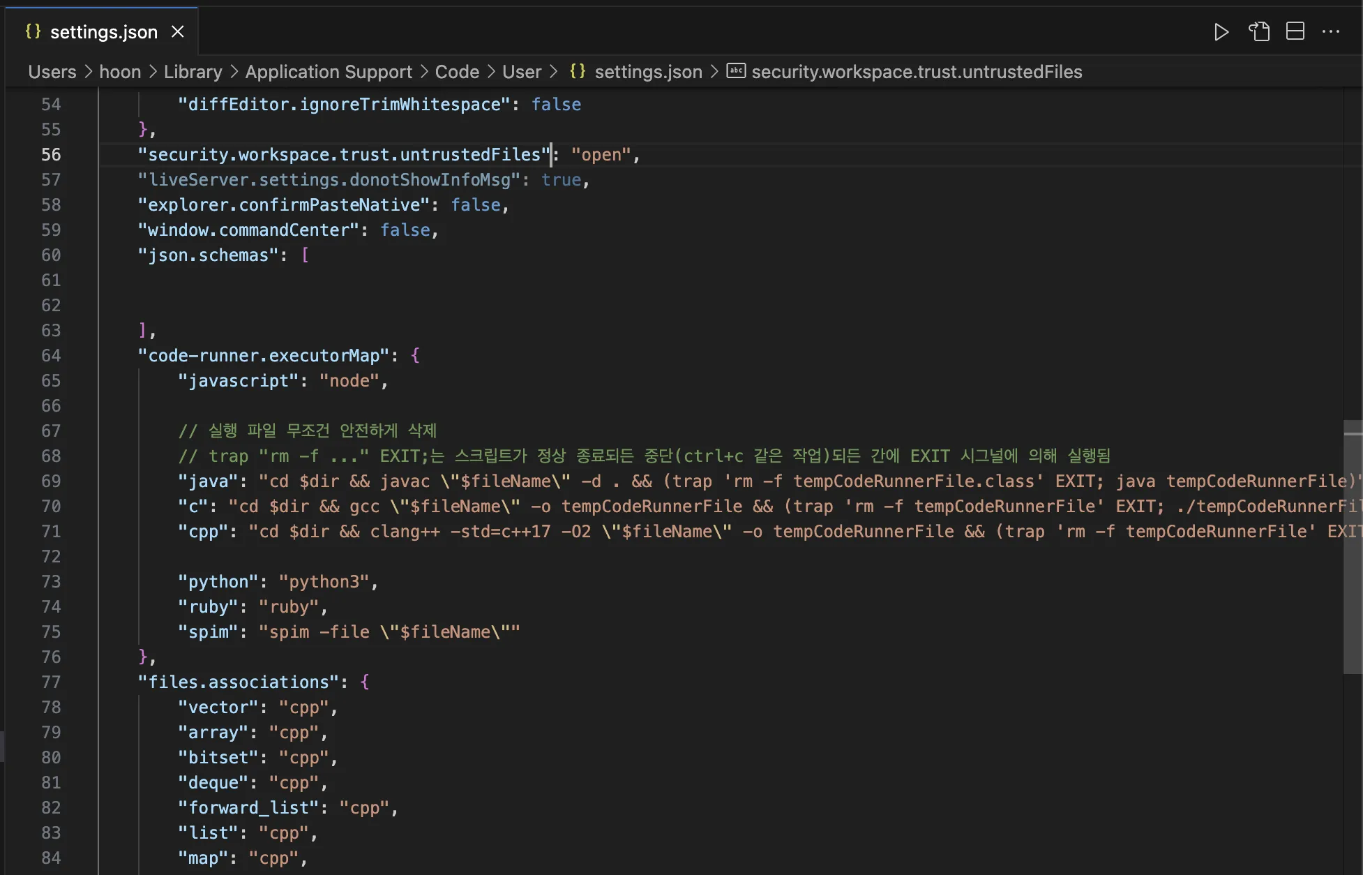 "code-runner.saveFileBeforeRun": true, // 실행버튼 누르면 자동으로 저장하고 실행하는 옵션