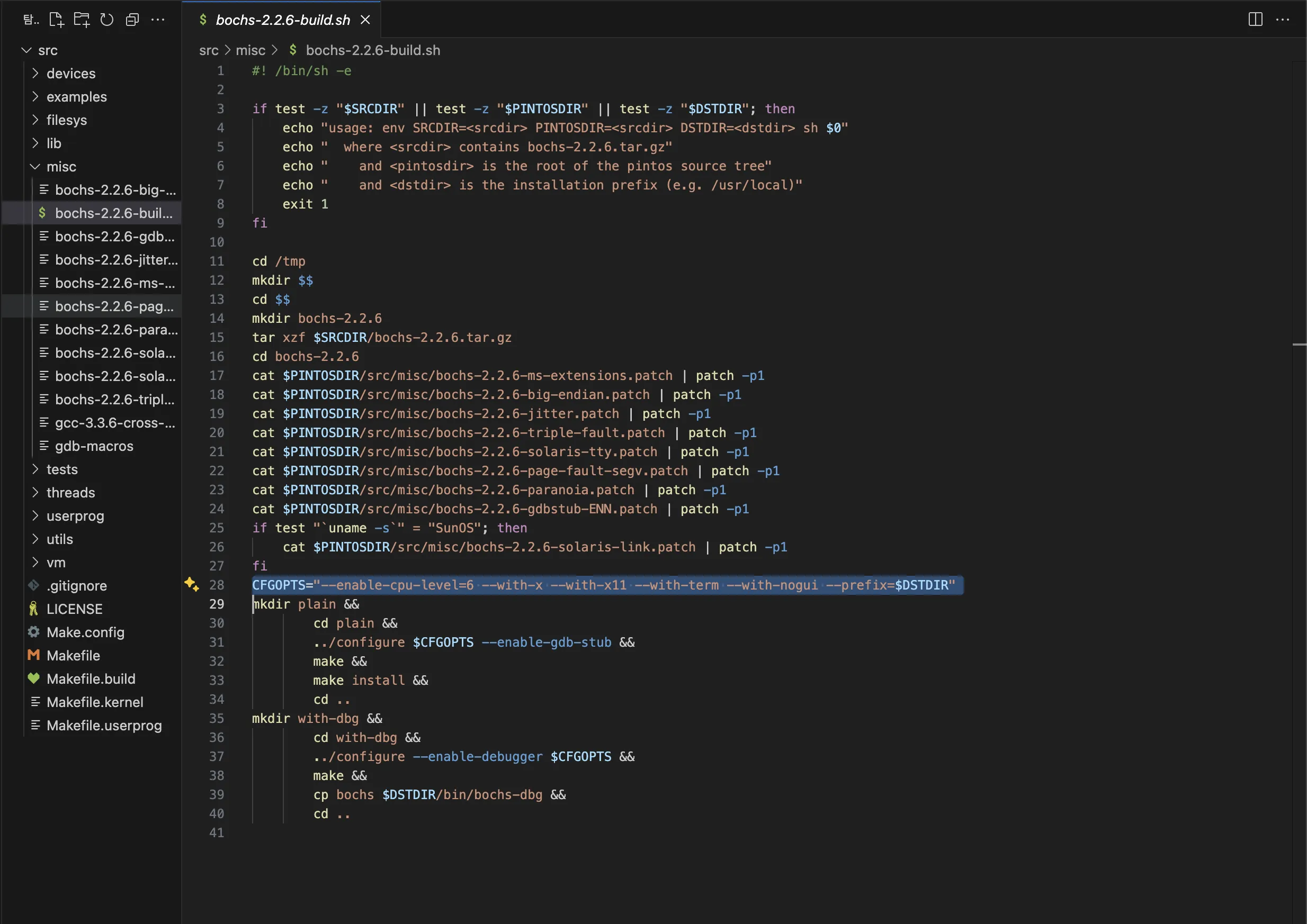 cd pintos/src/miscvi bochs-2.2.6-build.shi : 수정 모드 수정… ESC : 수정 모드 나가기 :wq : 저장 후 종료