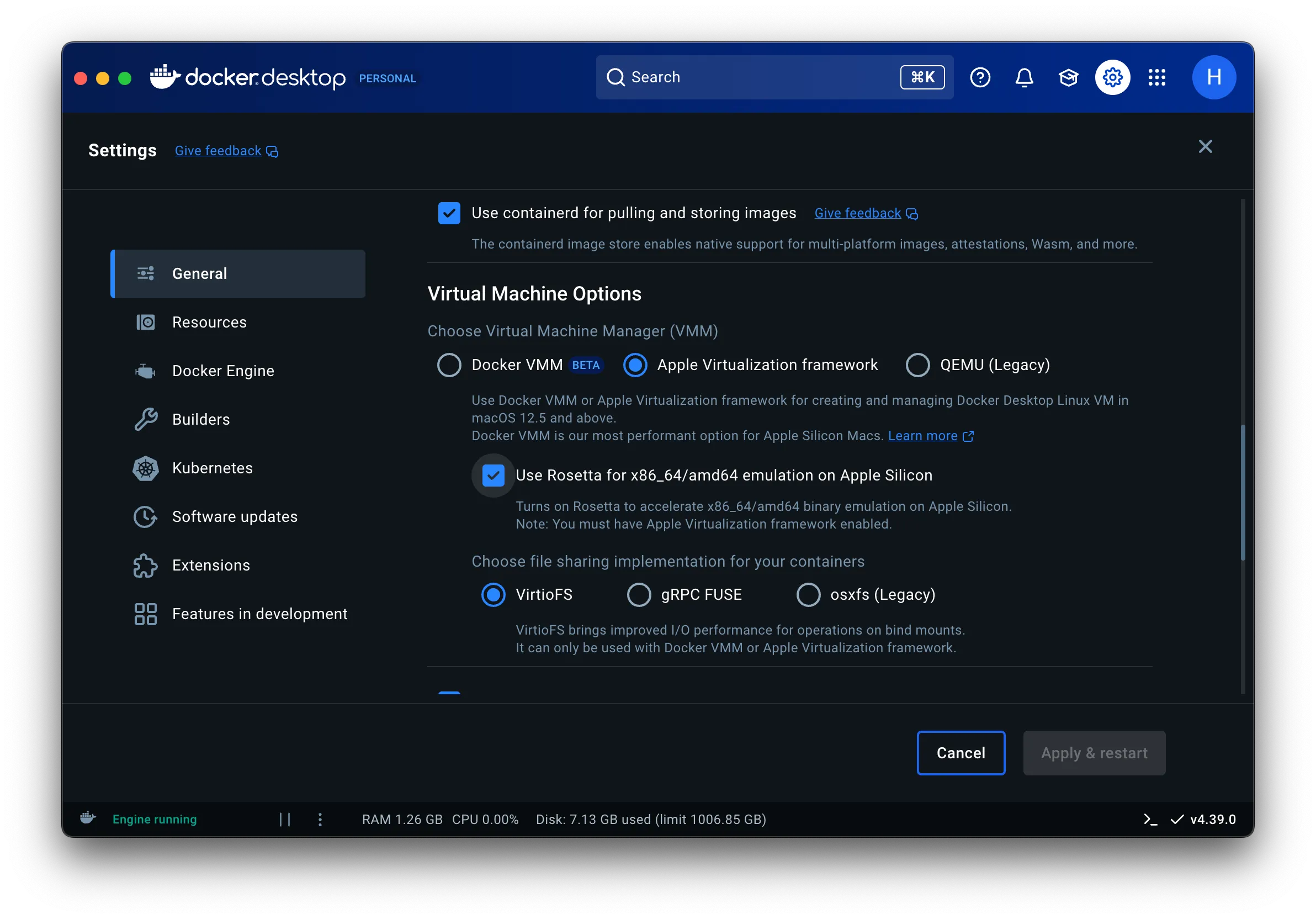 --platform=linux/amd64옵션으로 x86 이미지를 실행할 때, 내부적으로 QEMU를 이용해 에뮬레이션함.이때 Rosetta를 활성화하면 QEMU가 더 안정적이고 빠르게 동작함. 특히 오래된 리눅스 이미지(Ubuntu 12.04 같은 거)에서 apt-get이 죽거나 세그폴트 나는 경우, 대부분 Rosetta 꺼져 있어서 생기는 문제임.