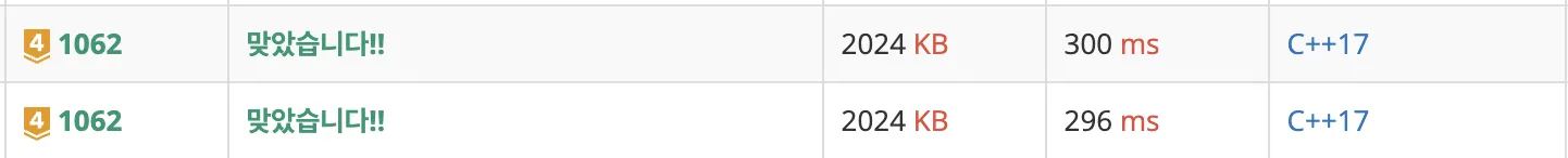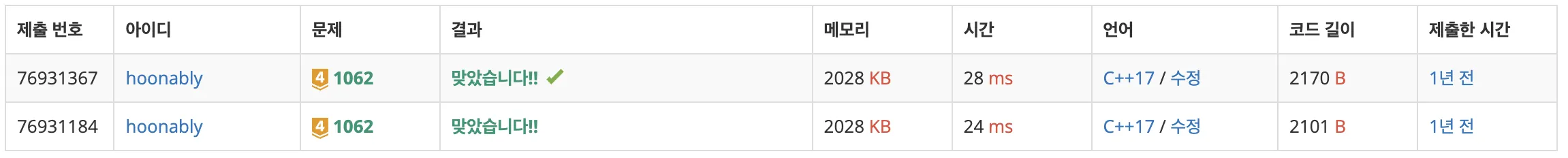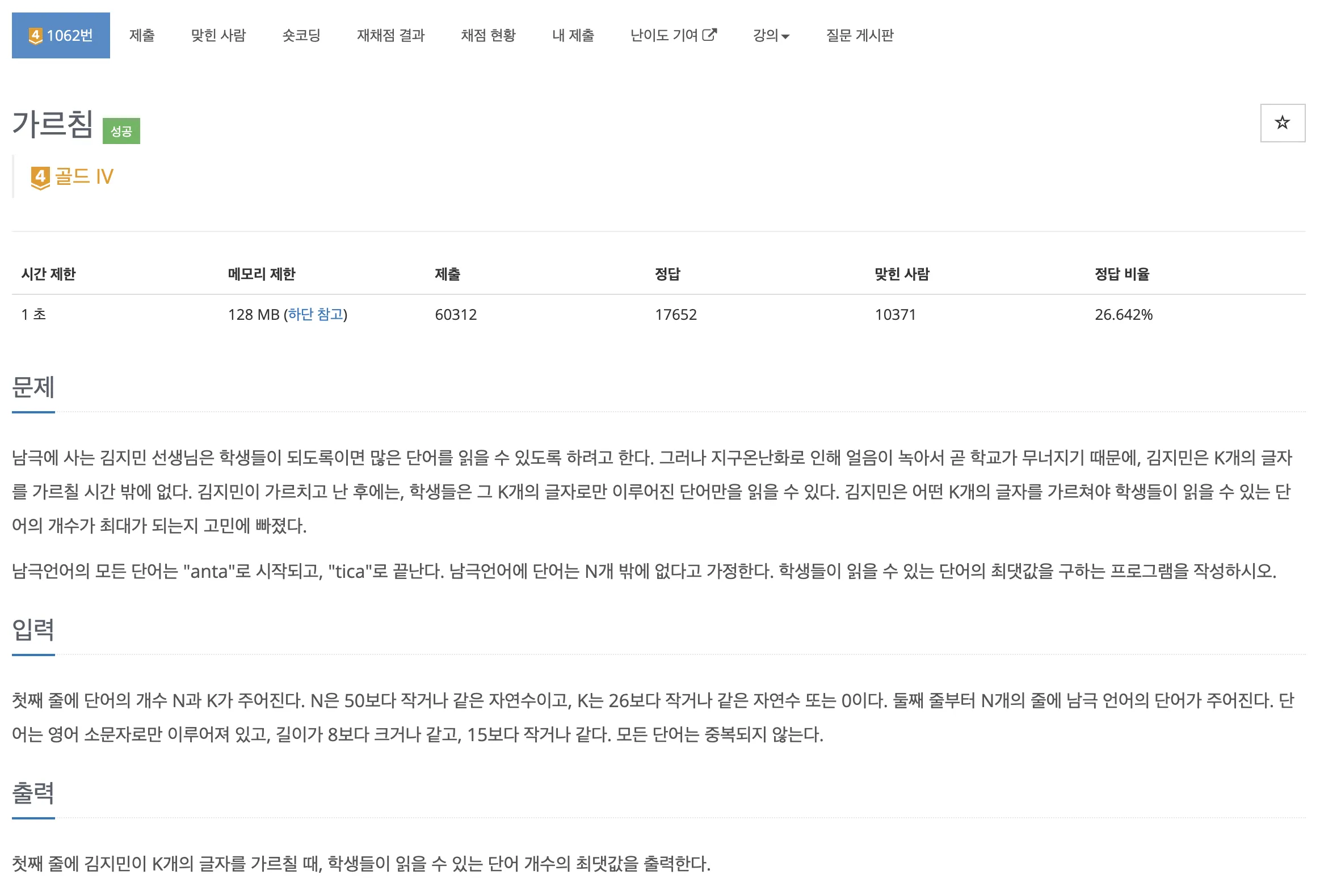 [๋ฐฑ์ค] [C++] ๐จโ๐ซ ๊ฐ๋ฅด์นจ 1062๋ฒ