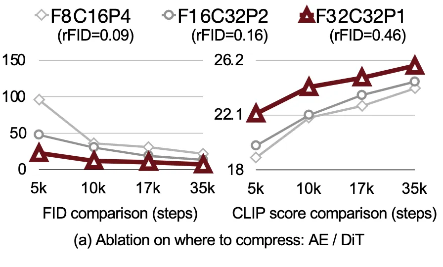 AE-F32C32P1 설정이 가장 뛰어난 성능(FID, CLIP Score)을 기록