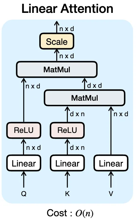 기존 Softmax 기반 Attention을 제거하고, ReLU를 이용한 Linear Attention을 채택