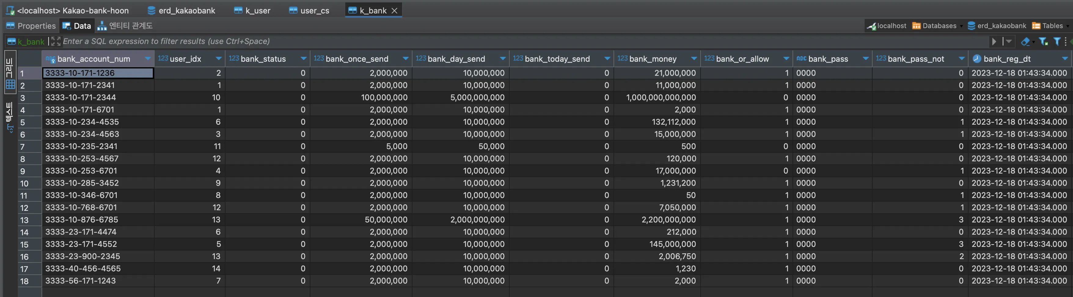카카오뱅크 계좌들의 정보를 k_bank에 넣어준다.