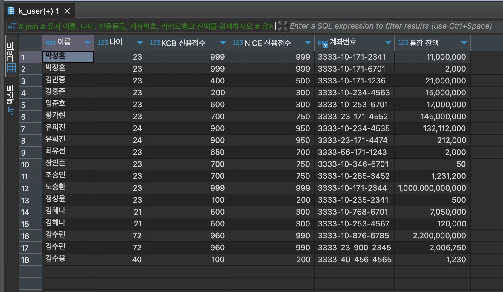 ❗ 유저 이름, 나이, 신용등급, 계좌번호, 카카오뱅크 잔액을 검색