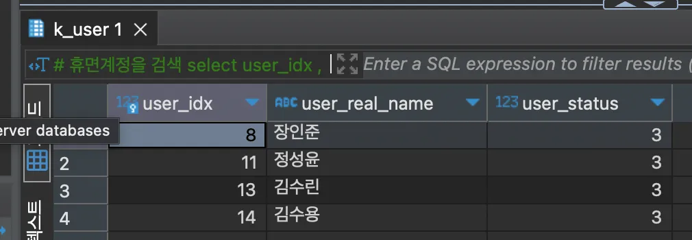 user_status int default 0 comment '0: 차단 / 1: 정상 / 2: 탈퇴 / 3. 휴먼',