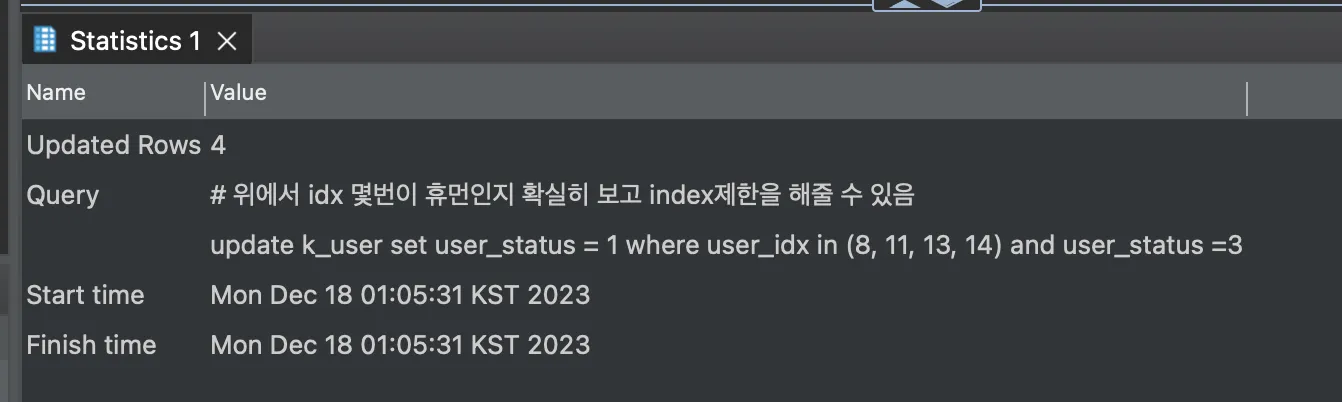 Updated Rows : 4 이므로 4개의 정보가 업데이트 된 것이다.